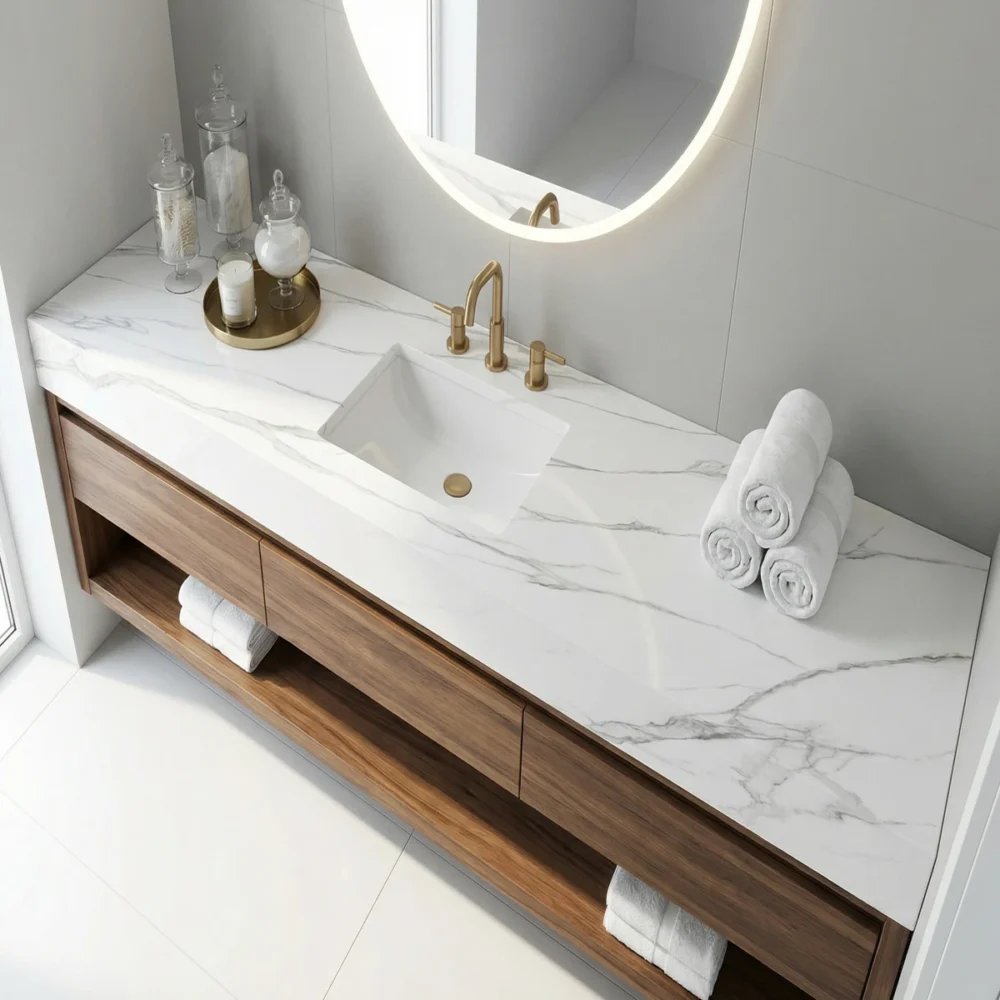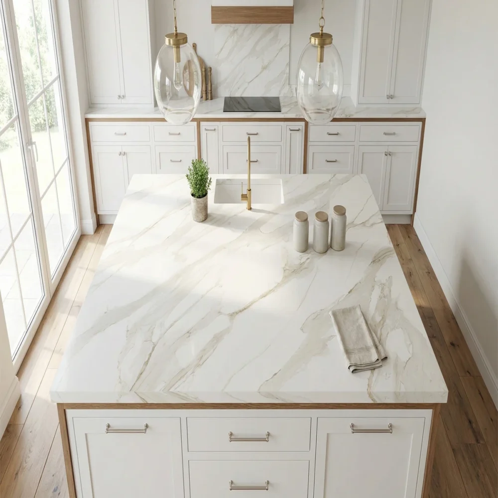 Calacatta Bianco quartz slabs on GQ-R0237 gives US wholesale buyers a printed marble-look face with Bright White and Pale Ash Gray, Warm Golden Brown for spec-driven hospitality and multifamily packages.