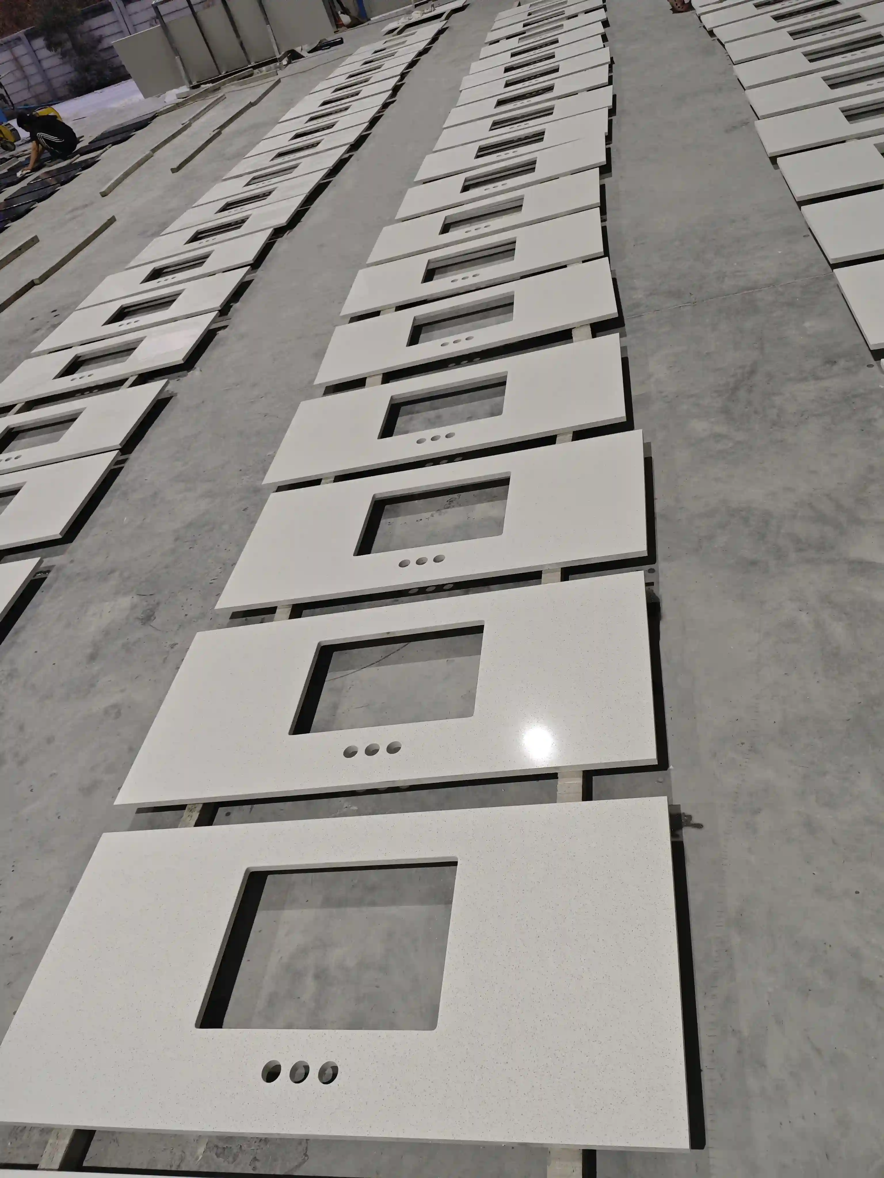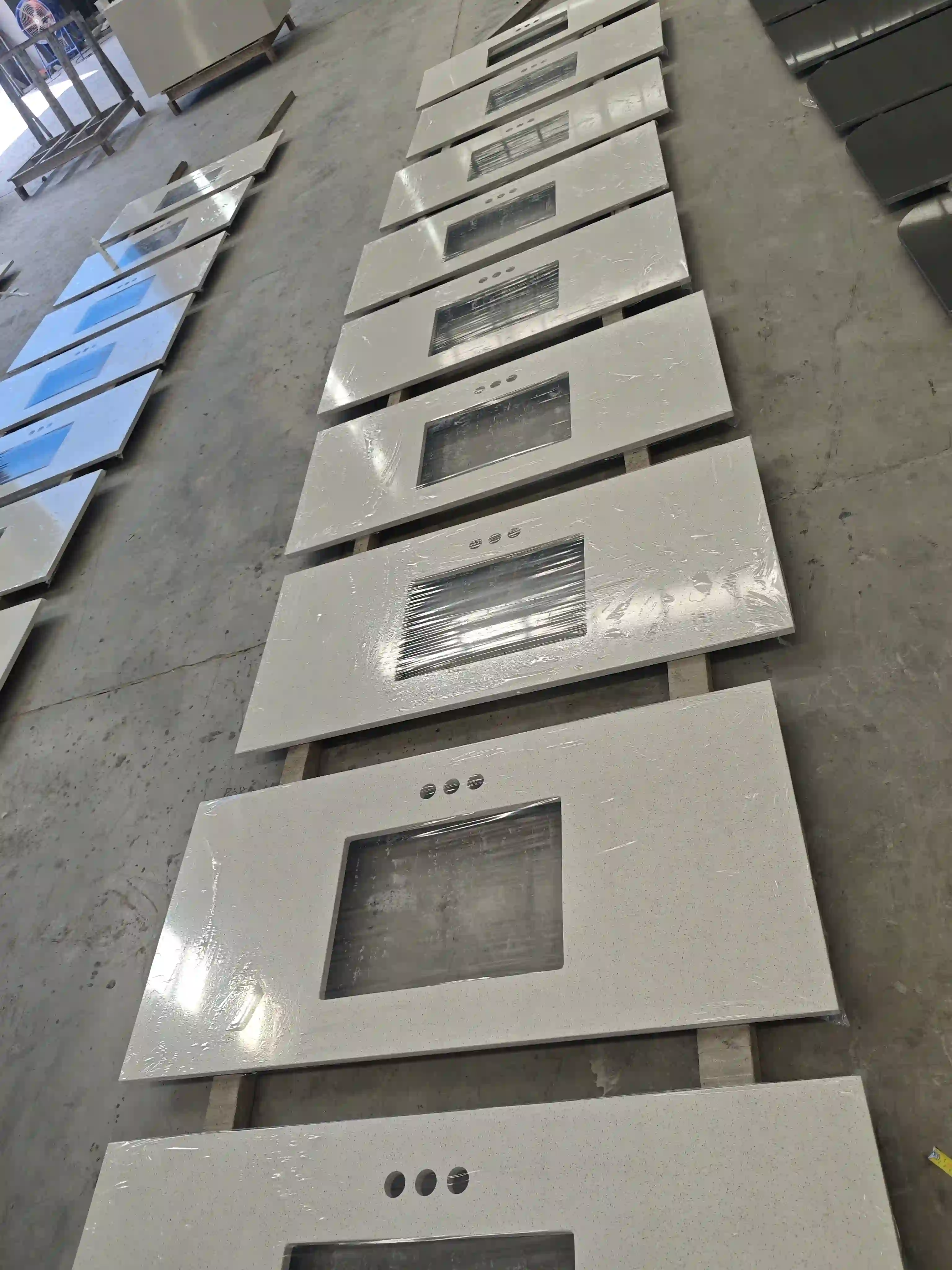 This project involves manufacturing over 100 countertops for a hotel chain. It relies on CNC automated production lines. The process ensures precise cutting and shaping for countertops of a uniform size (1200mm x 550mm x 20mm). Hundreds of units per batch have identical dimensions, cutout positions, and edge finishes. Machining tolerances are strictly kept within ±0.5mm. This ensures highly consistent installation results across all hotel bathrooms. It also improves on-site installation efficiency and shortens the project delivery time.