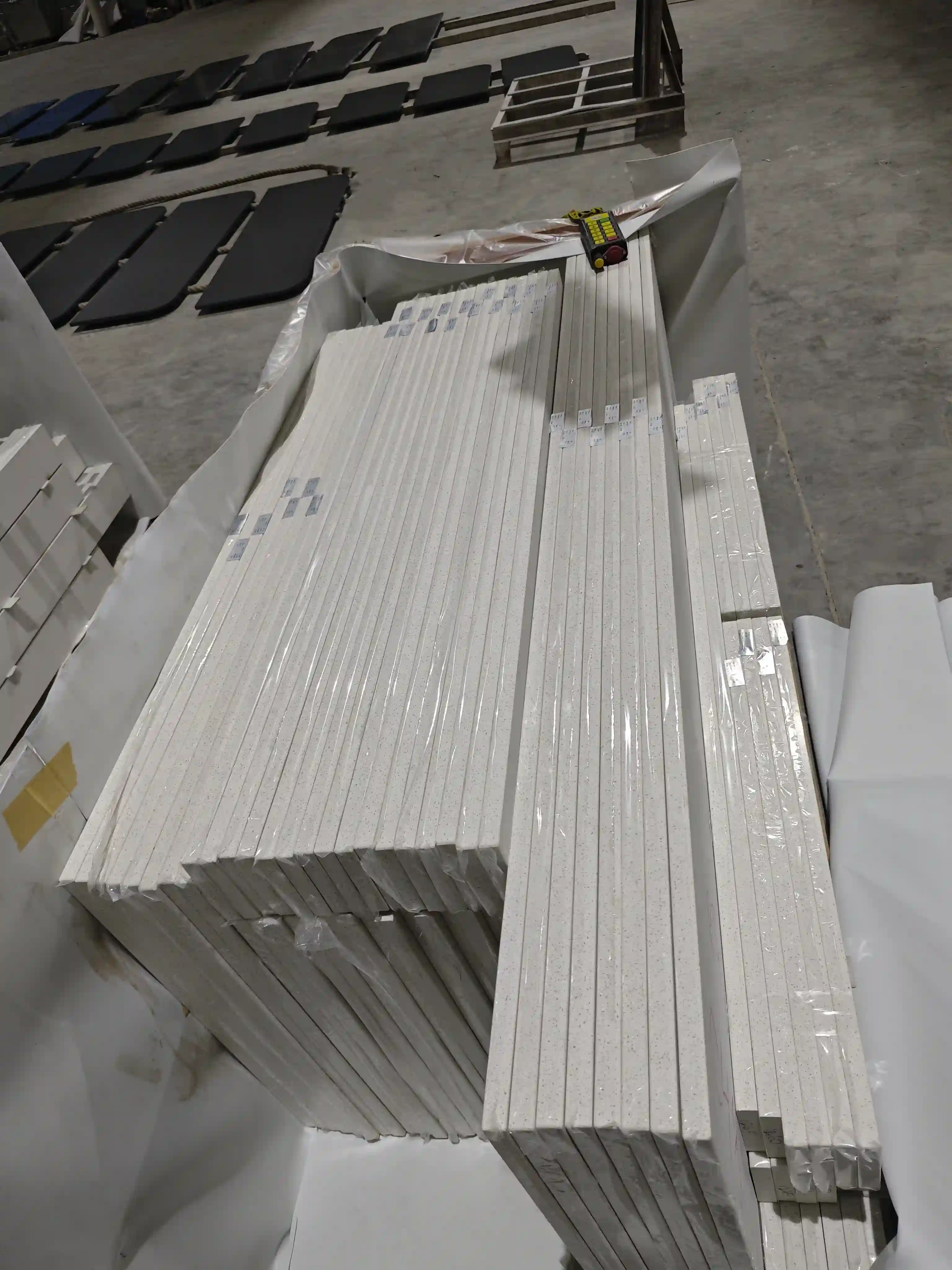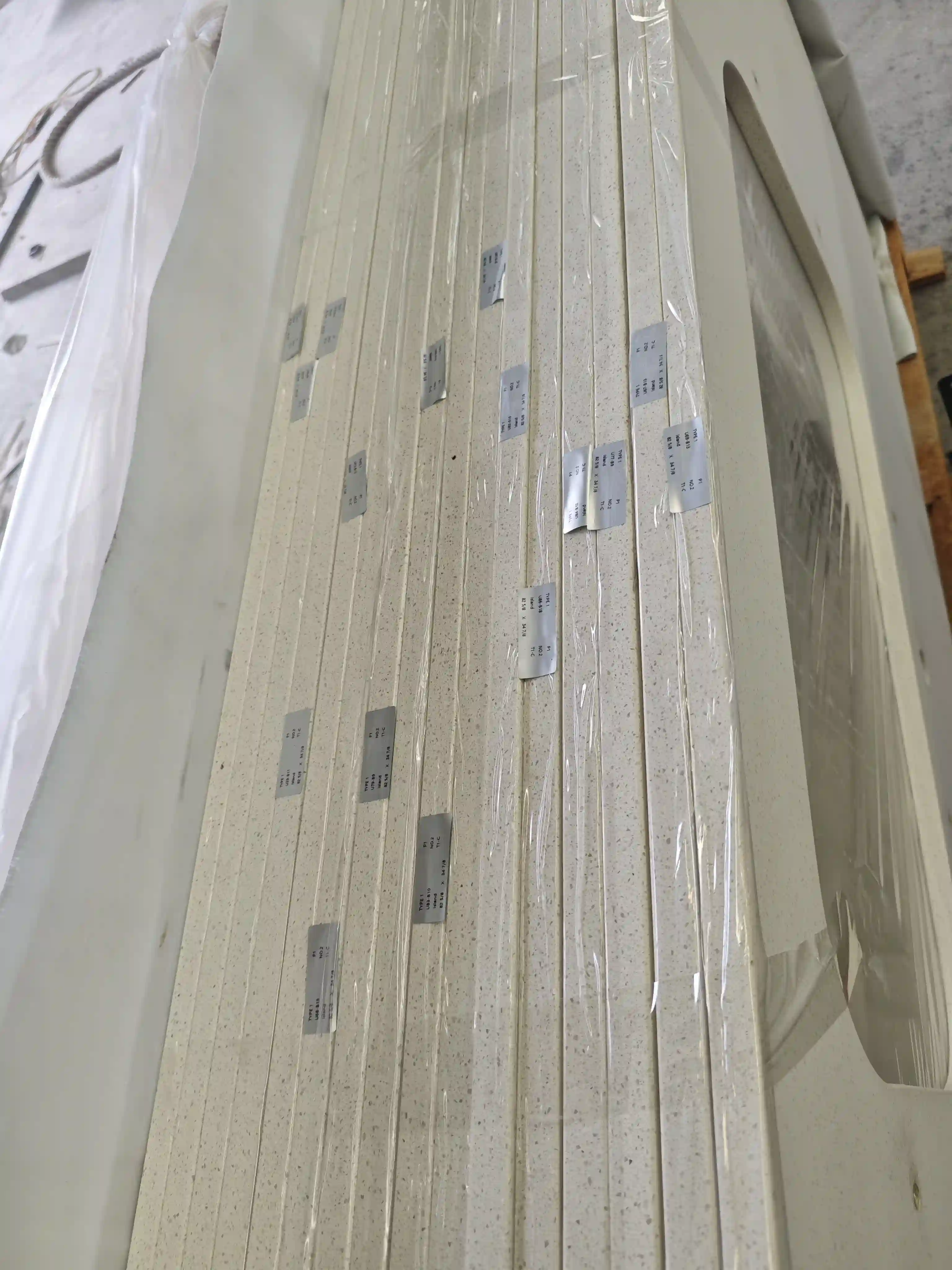 A professional packaging solution is used. It combines waterproof/damp-proof film with reinforced wooden pallets. Protective PE foam strips are placed between countertops. This prevents bumps and scratches during transport. Each pallet has a clear label showing specifications, order number, and batch number. The packaging meets international ocean shipping standards for moisture and impact protection. It ensures the US client receives the goods with zero damage.