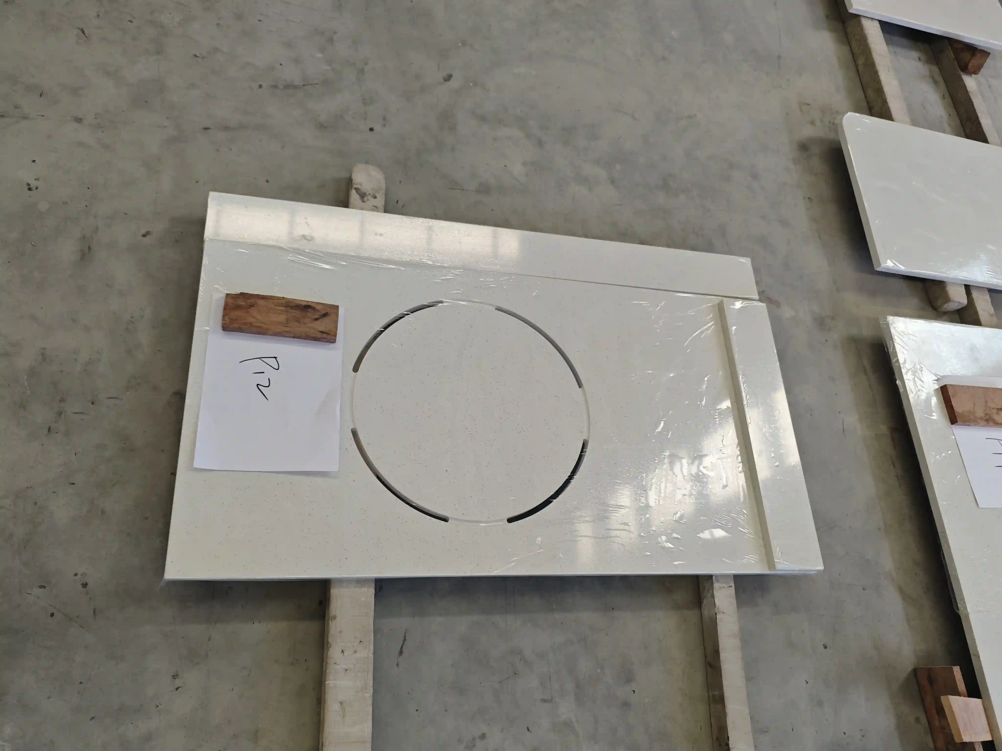 Bathroom Round Basin Countertop: A custom 1200mm x 550mm bathroom vanity top is fabricated, with a precisely cut 420mm diameter round basin hole. The cutout size error is controlled within ±0.5mm, fitting American-style recessed round basins.