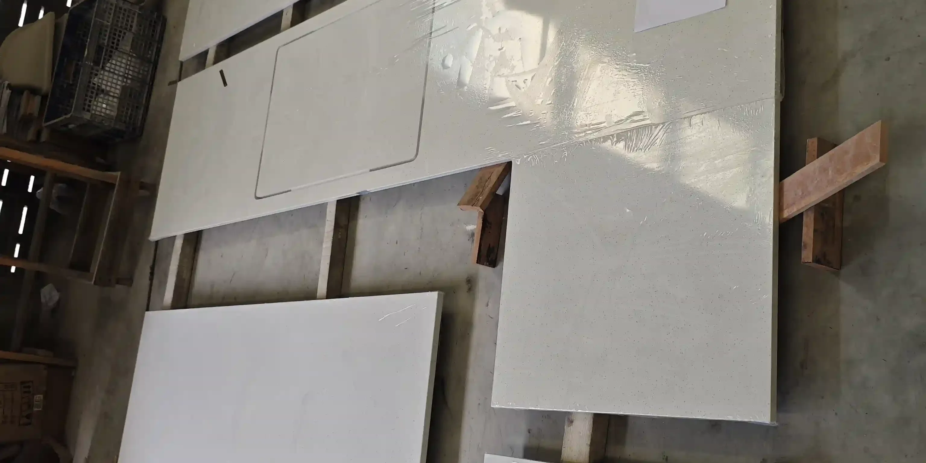 This is a customized quartz countertop project for the entire house of a US single-family home, covering kitchen and bathroom spaces. The project involves the fabrication of a kitchen L-shaped island countertop, bathroom round basin countertops, countertops with recessed slots for functional areas, and matching shaped filler pieces. The finished products have been shipped to a US B2B residential renovation contractor client.