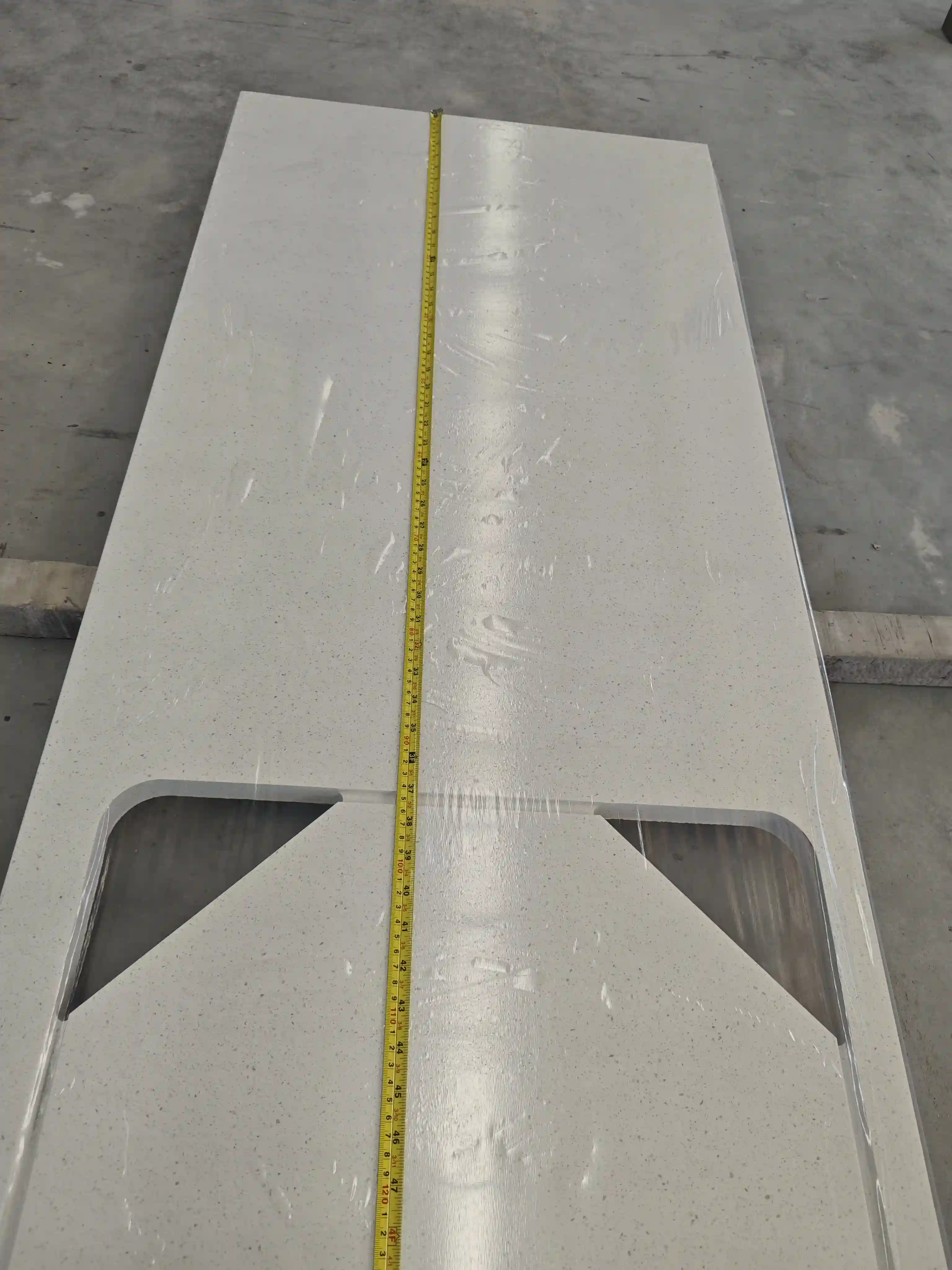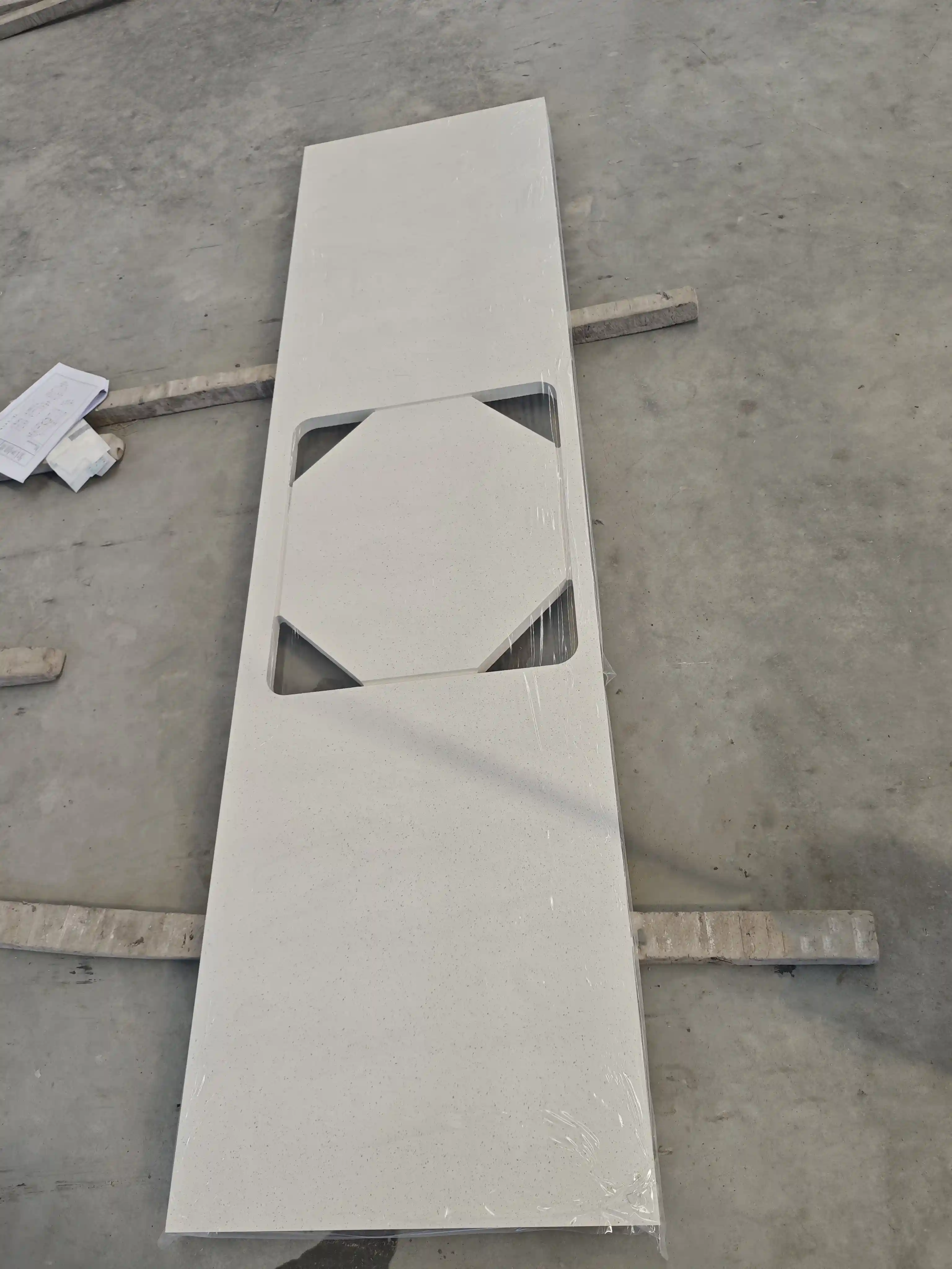 Project CAD drawings are checked against the actual products. Key parameters are verified, including the overall dimensions of the double U-shaped countertop, the size and center distance of the U-shaped cutouts, the diameter of circular cutouts, and the specifications of irregular components. This ensures 100% of the countertops meet the client’s customized installation requirements.