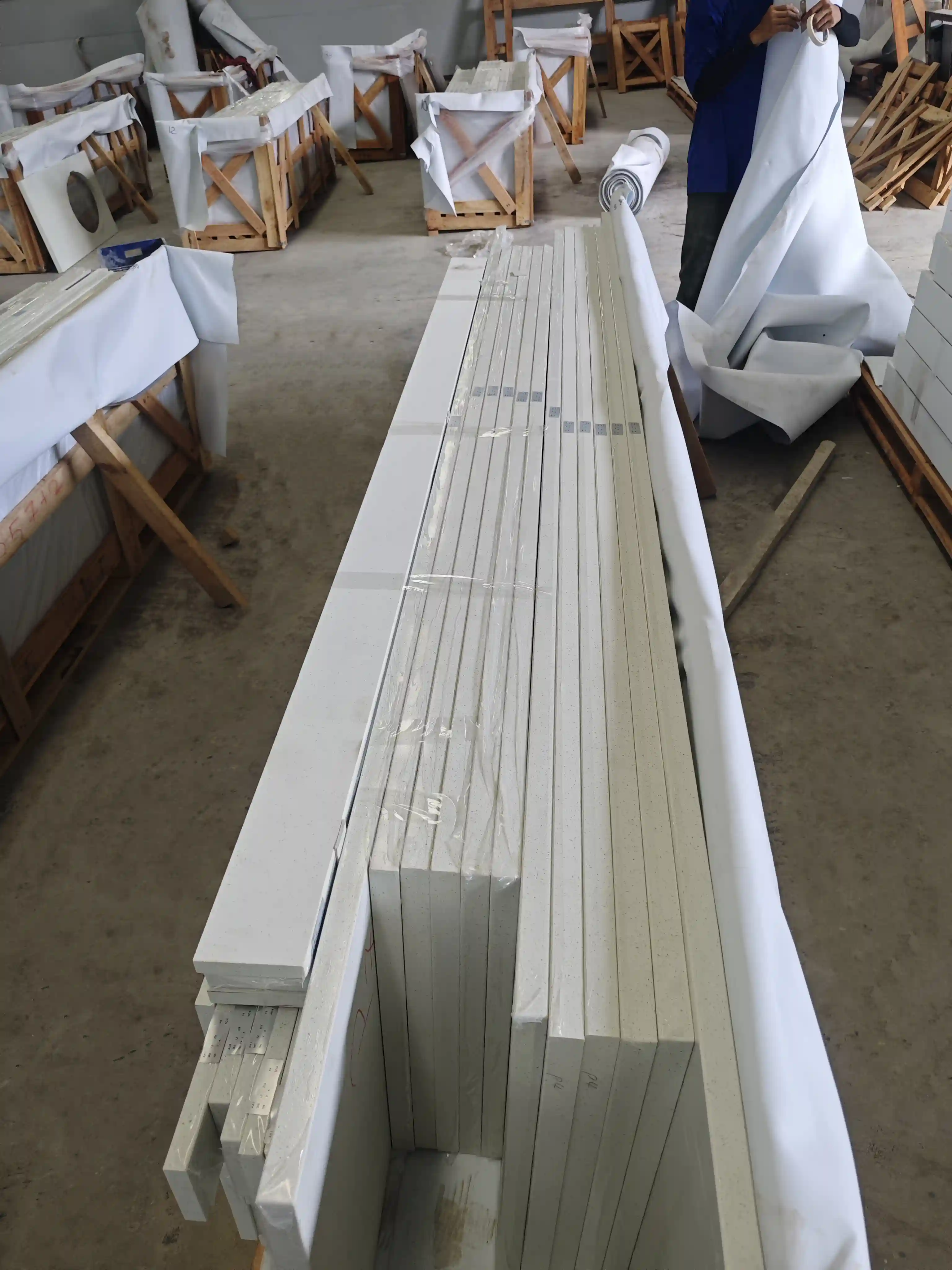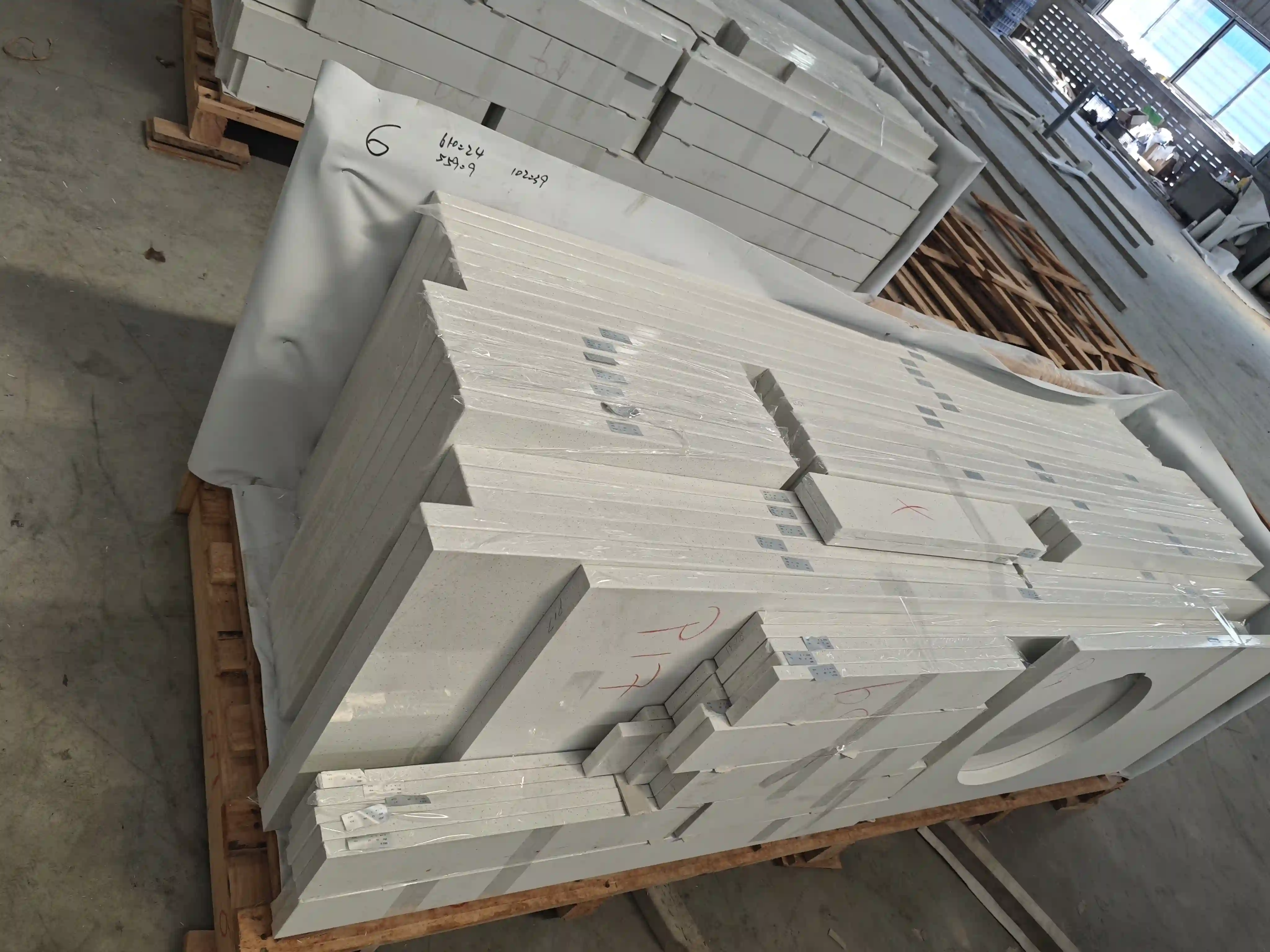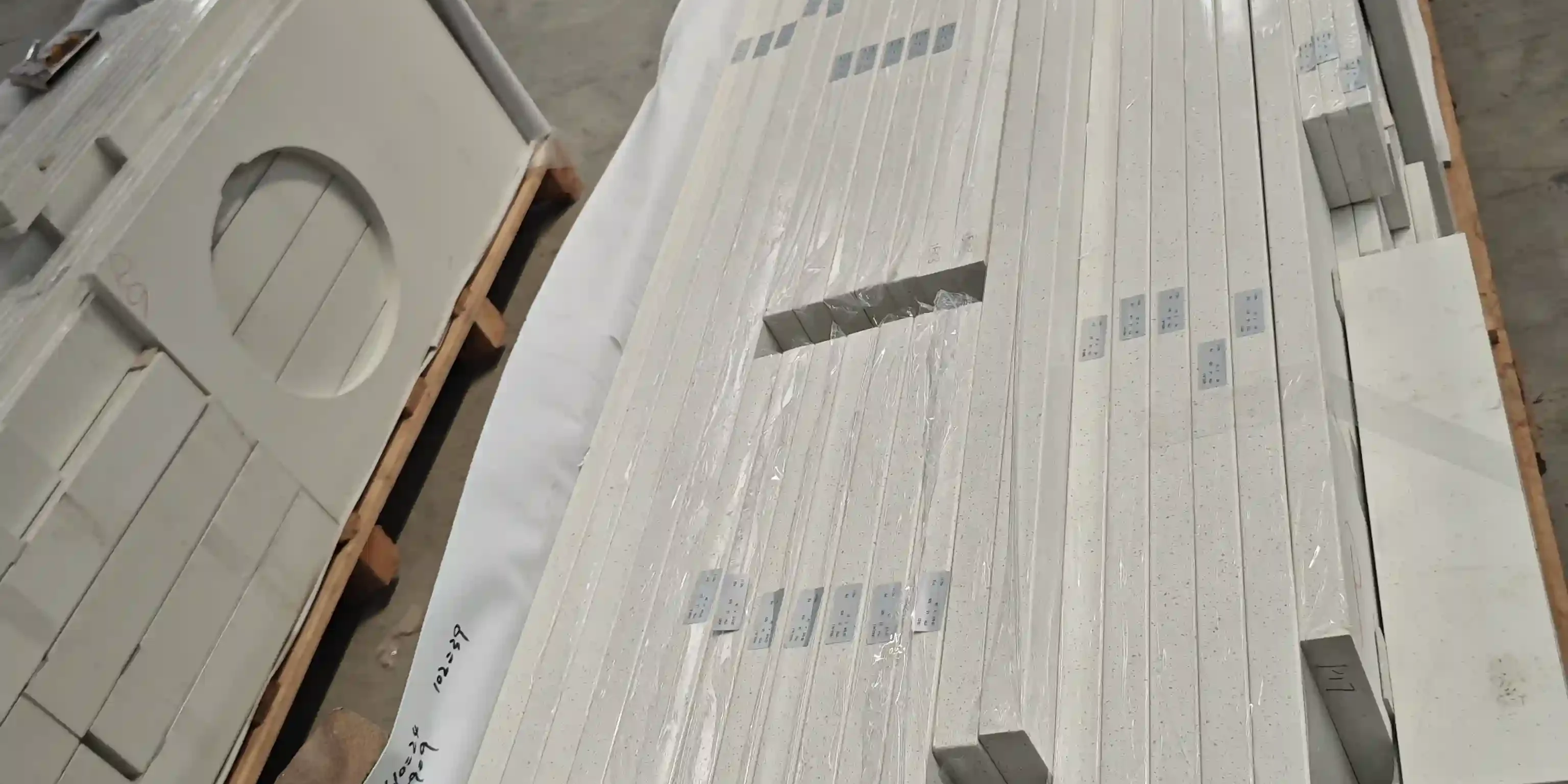 A professional packaging solution combining waterproof/damp-proof film and reinforced wooden pallets is used. Irregular components are individually protected, and protective strips are placed between countertops to prevent bumps and scratches during transport. Each pallet carries a clear label with specifications, order number, and batch number. The packaging meets international ocean shipping standards for moisture and impact protection, ensuring the US client receives the goods with zero damage.